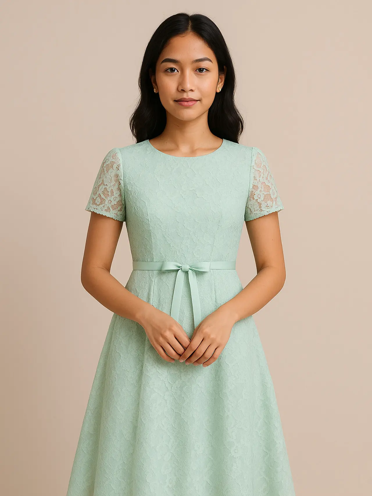 Potongan V-neck atau kerah rendah menambah kesan feminin, sementara brokat dengan motif sederhana menjaga tampilan tetap minimalis. Dress ini cocok untuk acara formal maupun semi-formal. Padukan dengan perhiasan sederhana untuk melengkapi penampilan.