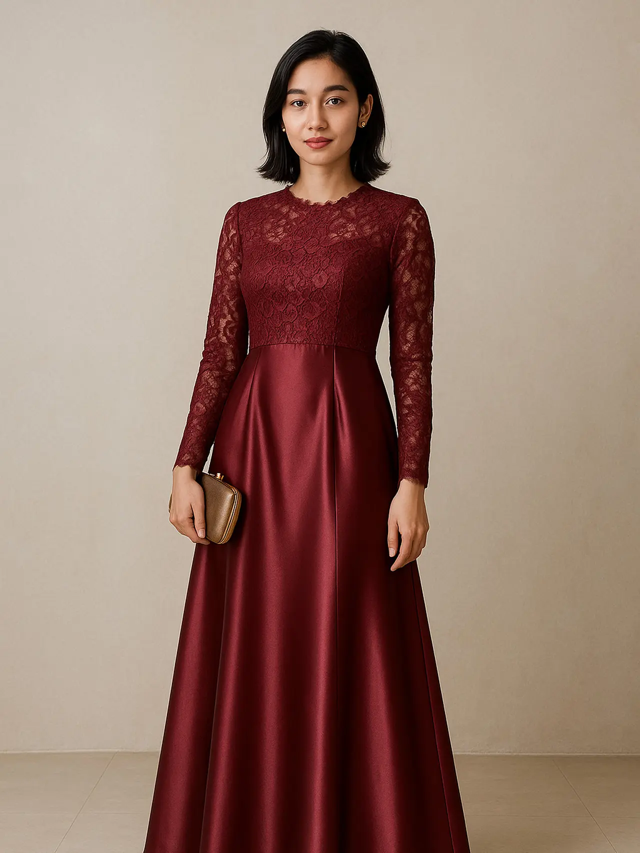 Perpaduan antara brokat dan satin pada long dress menghadirkan kontras tekstur yang menarik dan memikat. Brokat berperan memberikan detail serta struktur, sementara satin menambahkan efek kilau lembut yang memperkaya tampilan. Warna-warna elegan seperti maroon atau navy semakin menegaskan nuansa mewah dan berkelas.