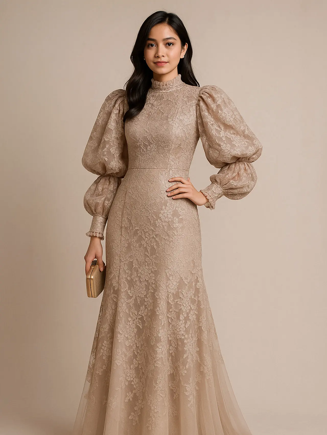 Desain lengan balon pada long dress brokat menghadirkan volume di bagian atas busana, menciptakan kesan dramatis namun tetap berkelas. Potongan ini sangat cocok bagi Anda yang ingin menonjolkan area bahu dan lengan secara elegan. Dipadukan dengan warna-warna netral seperti nude atau abu-abu, keseluruhan tampilan memancarkan nuansa mewah tanpa kesan berlebihan.