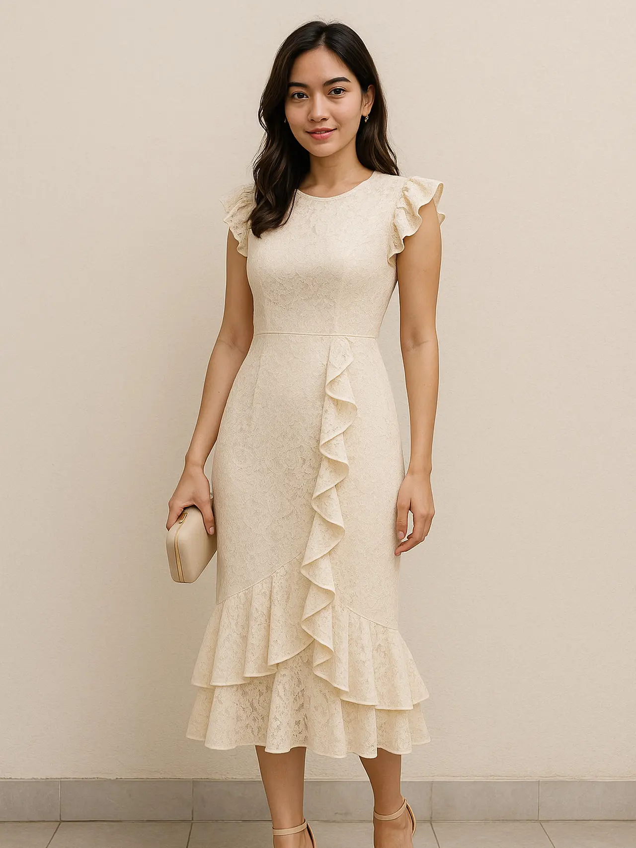 Midi dress brokat dengan aksen ruffle berwarna krem menjadi pilihan yang memancarkan pesona lembut, ideal untuk berbagai agenda spesial.