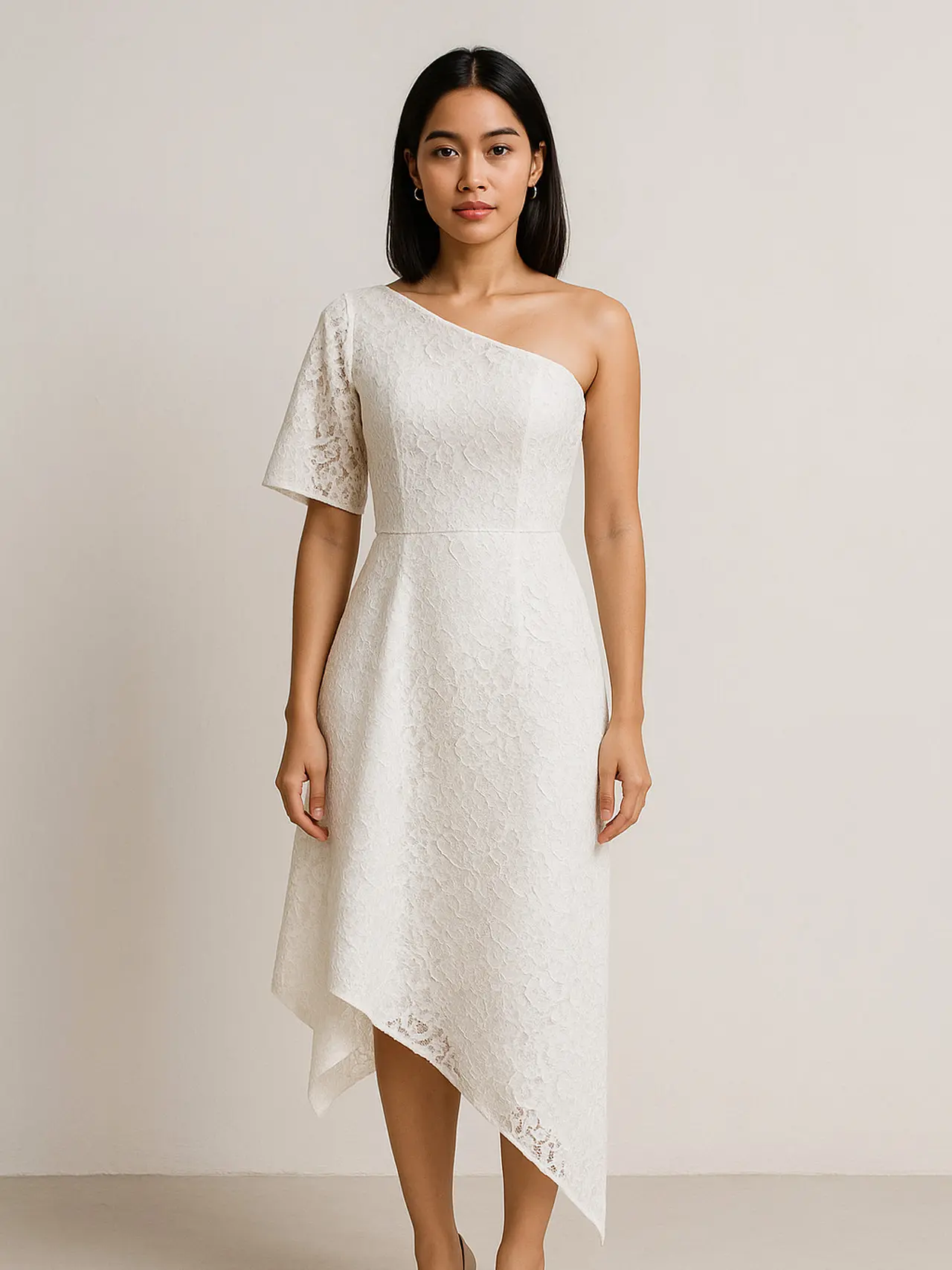Long dress brokat dengan potongan asimetris warna putih menawarkan kesan modern yang kuat, menjadikannya pilihan ideal untuk beragam acara resmi.