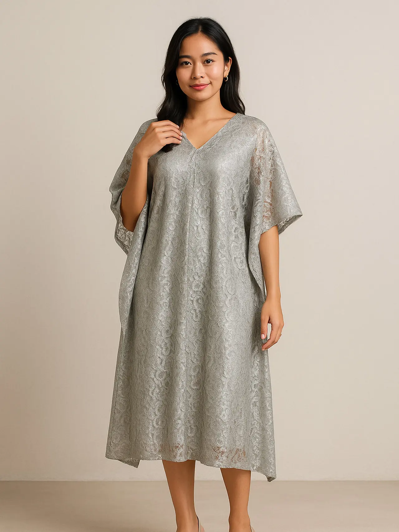 Midi dress brokat model kaftan berwarna silver menjadi opsi trendi yang memadukan kenyamanan dan gaya, ideal untuk beragam kesempatan.