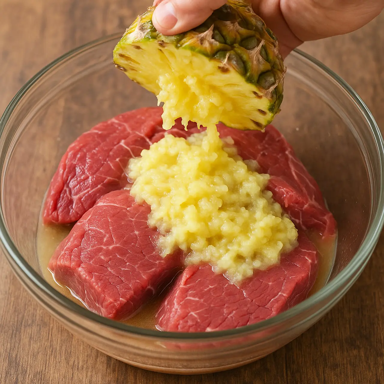 - Marinasi dengan Bahan Alami: Gunakan parutan atau jus nanas selama 15–30 menit. Alternatif lainnya adalah membungkus daging dengan daun pepaya, merendam dalam larutan cuka, atau air jeruk nipis/lemon selama 25 menit. Air asam jawa dan belimbing wuluh juga efektif dalam proses ini.